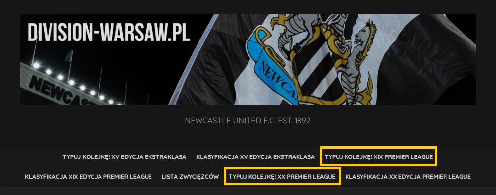 Wyznawcom teorii spiskowych tradycyjnie przypominam, że mecze typerków XIX i XX edycji Premier League typujemy wchodząc w odpowiednie zakładki w belce pod bannerem Newcastle Utd na stronie głównej zgodnie z załączonym obrazkiem. Dla osób niedowidzących zakładki są zaznaczone w ciemnożółte ramki.