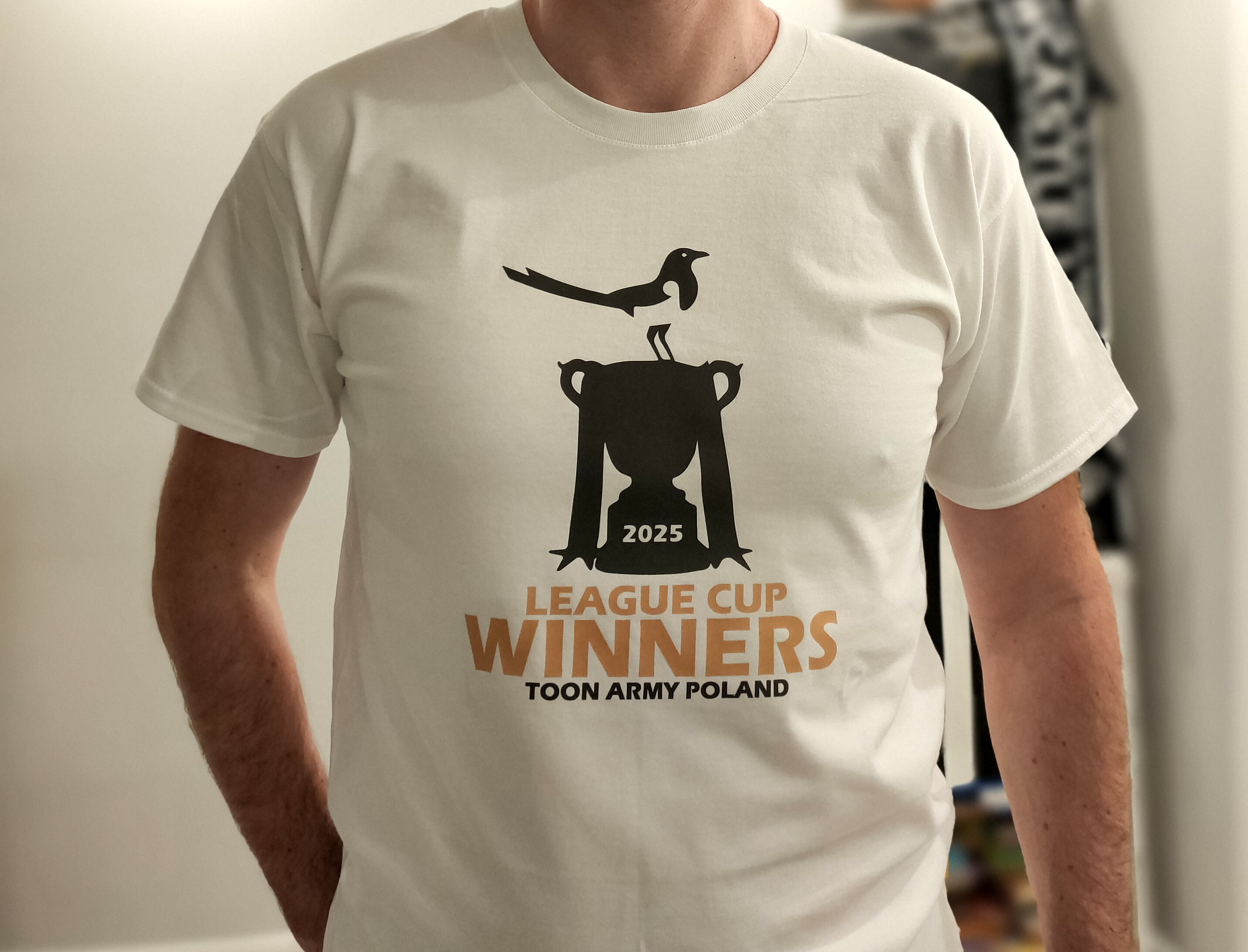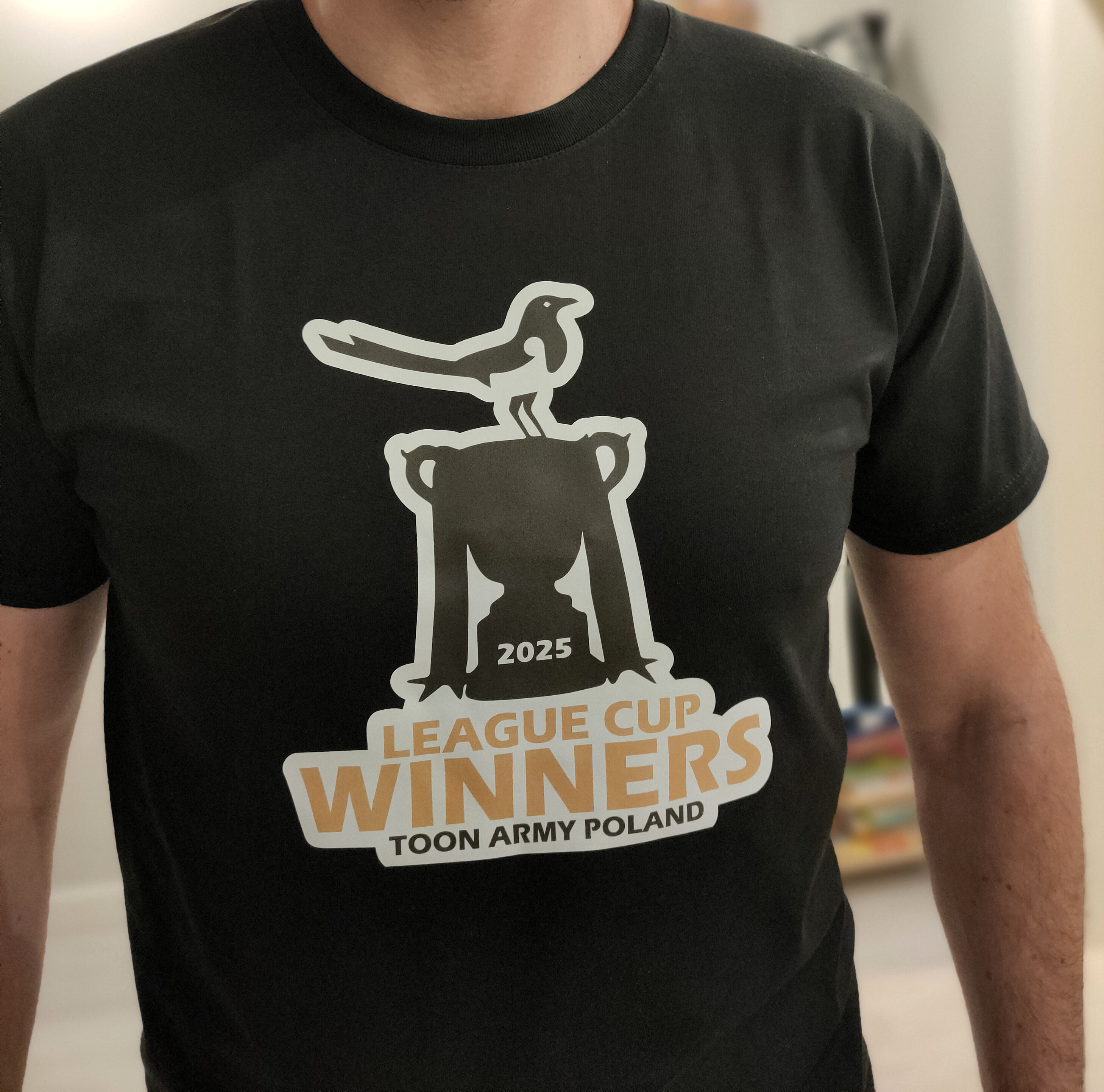 Przypominam, że jeszcze można zamówić okolicznościową koszulkę z okazji wygrania przez Newcastle United Pucharu Ligi 2025 (słynnego Carabao Cup – hejterkom od Kakao Cup czy pucharu biedronki pokazujemy środkowy palec). Pierwsze jakiekolwiek trofeum od 1969 roku i pierwsze od 1955 roku angielskie trofeum dla „Srok” spowodowało, że polskie środowiska Newcastle United – Toon Army Poland wydało pamiątkowy t-shirt. Szczegóły odnośnie koszulek i sposobu zamówienia TUTAJ